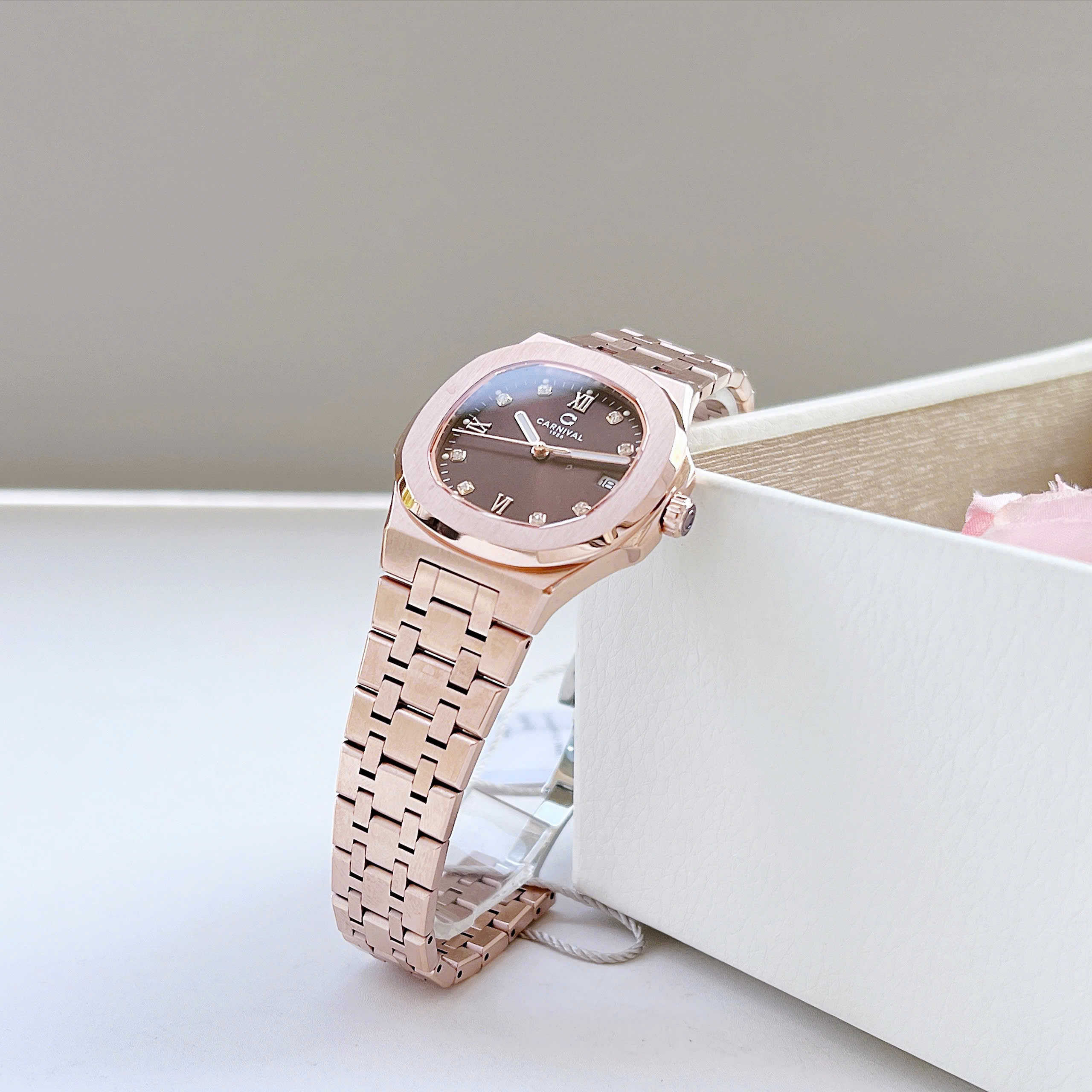 Đồng hồ Carnival được thiết kế với sự cân đối và hiện đại, lấy cảm hứng từ thiết kế cổ điển và thể thao. Dưới đây là mô tả tổng quan về thiết kế của đồng hồ này: