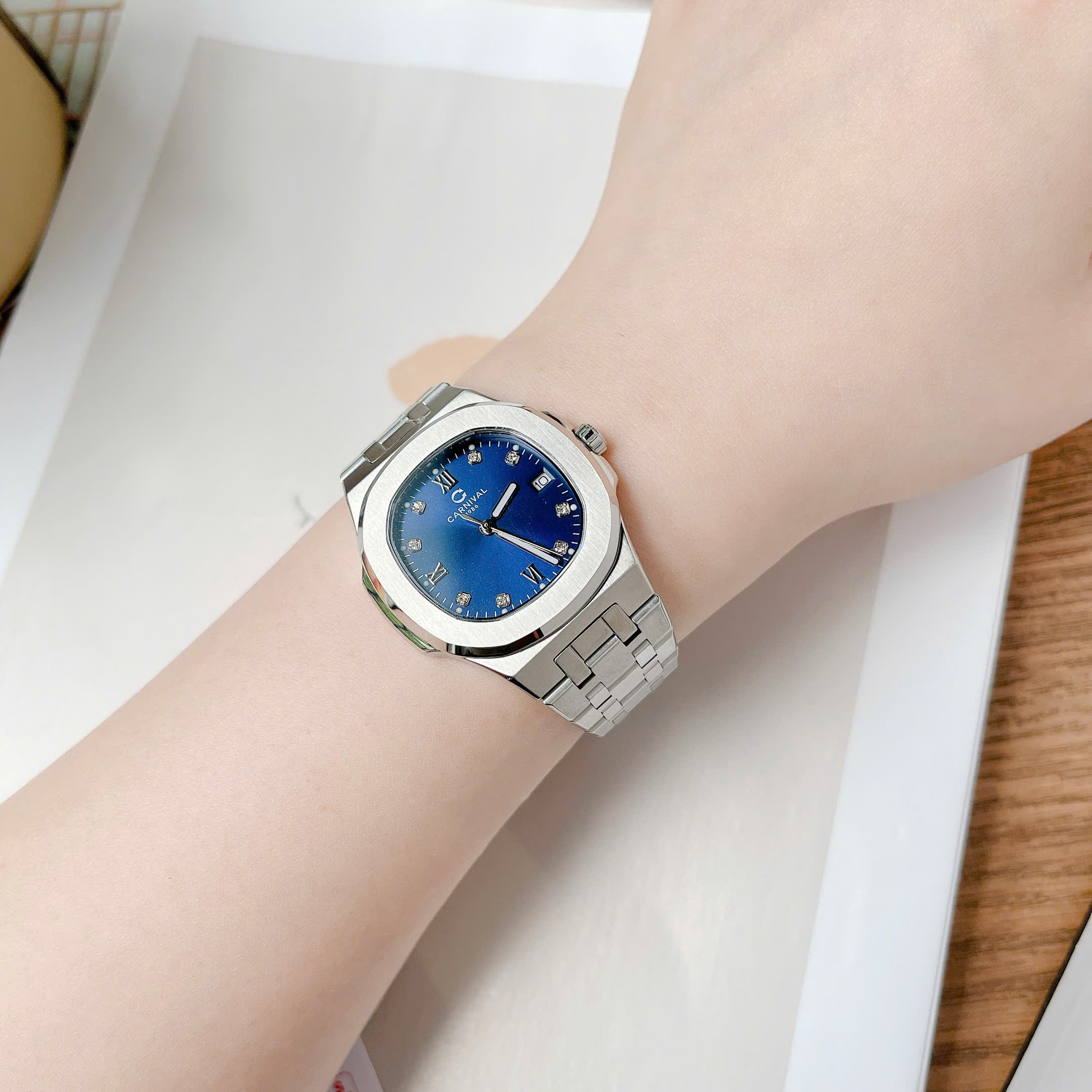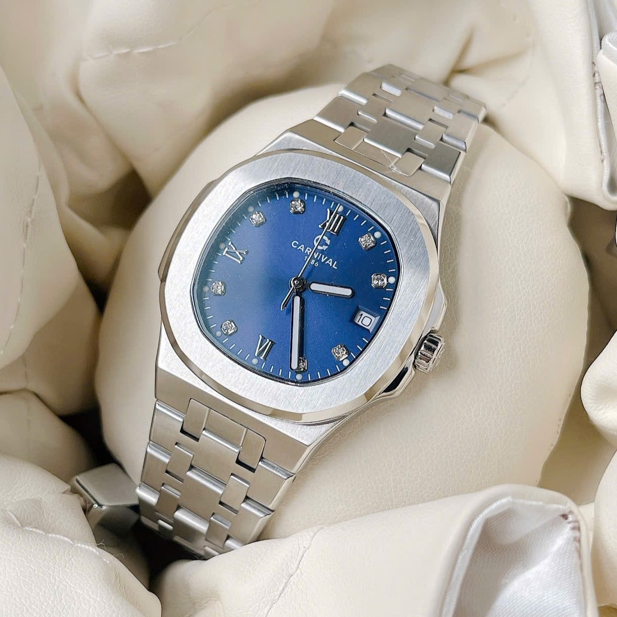 Mặt đồng hồ: Mặt đồng hồ của Carnival có thiết kế tròn với một nền số đen hoặc xanh đậm, tạo nên sự nổi bật và lịch lãm. Chỉ số và kim được làm từ vật liệu phản quang, giúp dễ dàng đọc giờ trong mọi điều kiện ánh sáng.