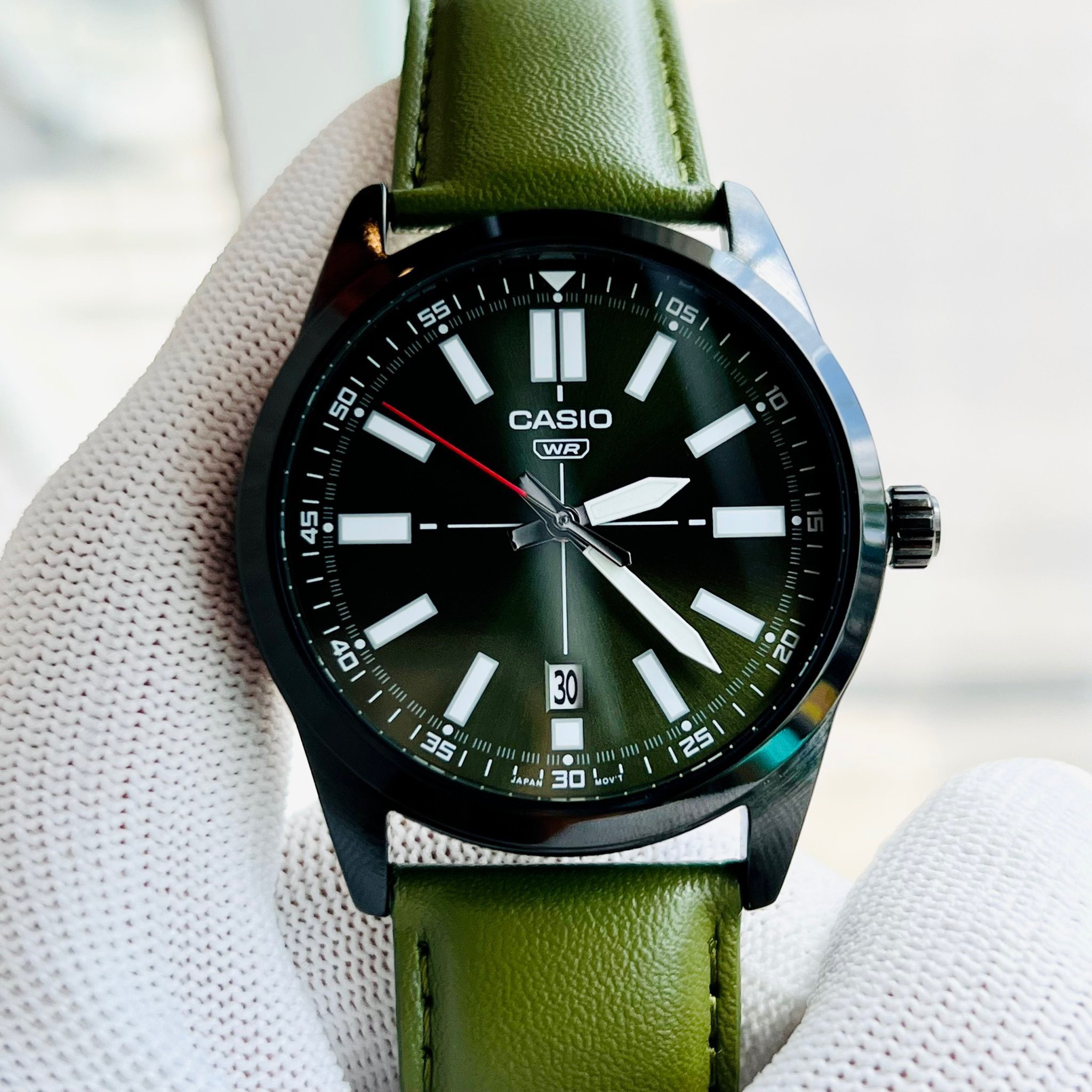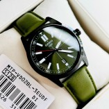Đồng hồ Casio Nam MTP-VD02BL-3E có thiết kế đơn giản, nam tính và hiện đại với mặt số màu xanh lá cây và dây đeo bằng da màu nâu đậm.