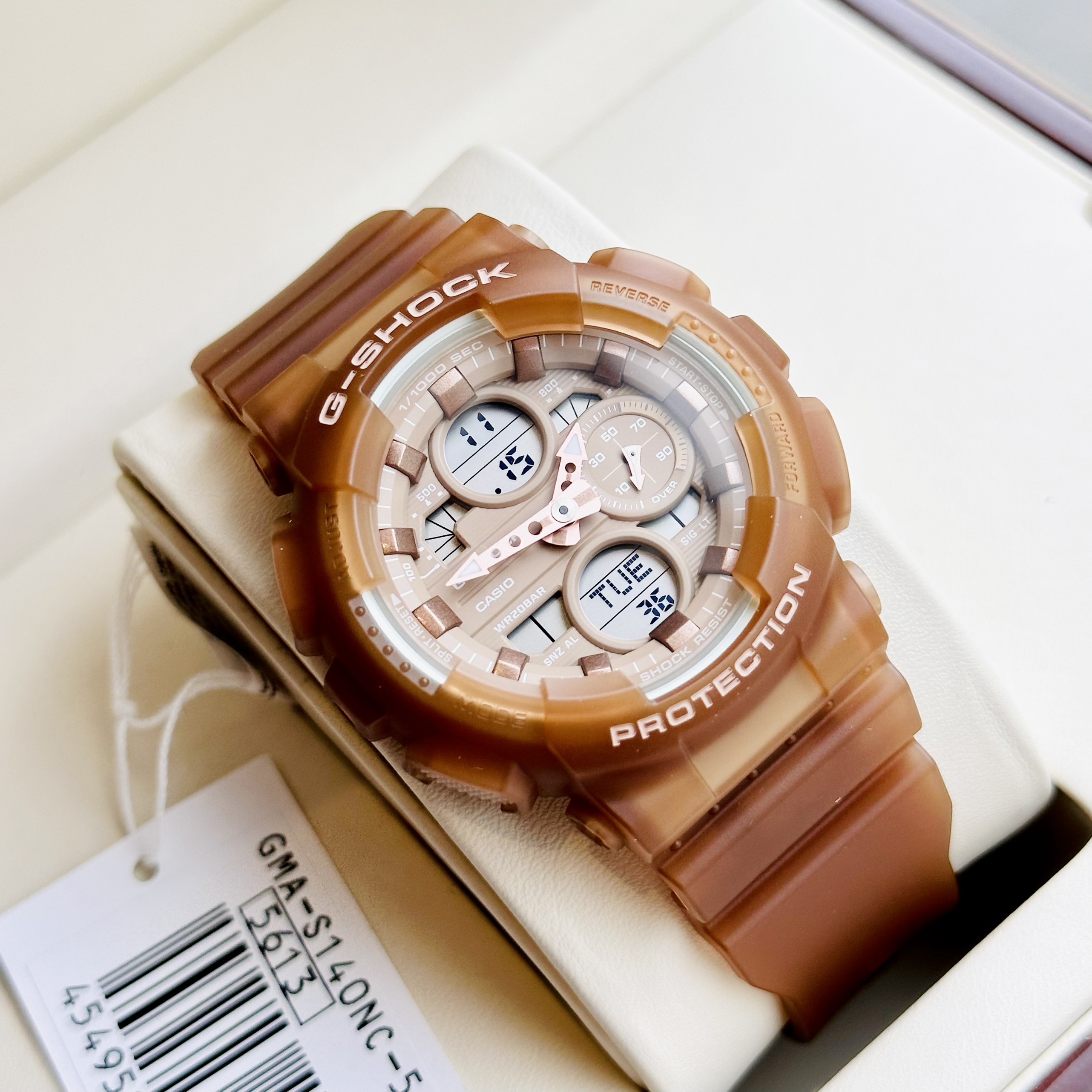 Thiết kế ngoại hình của đồng hồ Casio G-Shock GMA-S140NC-5A2DR là một điểm nổi bật của sản phẩm này. Với màu sắc chủ đạo là nâu và đen, kết hợp với các chi tiết mạ vàng đồng, đồng hồ G-Shock GMA-S140NC-5A2DR tạo ra một vẻ ngoài thời trang và nam tính.