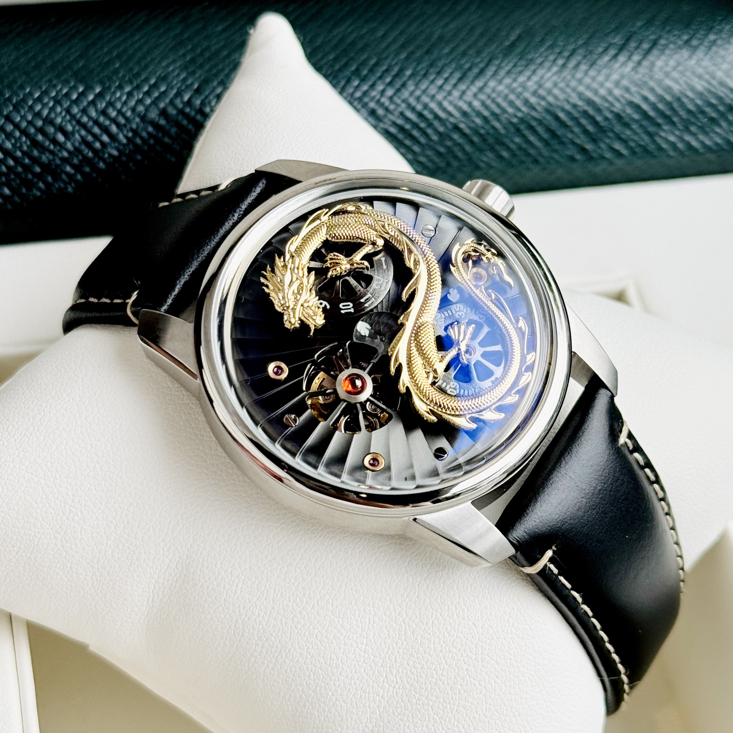 Đồng Hồ Nam OBLVLO Dragon Gold – Viền Bạc – 42mm – Automatic – Sapphire