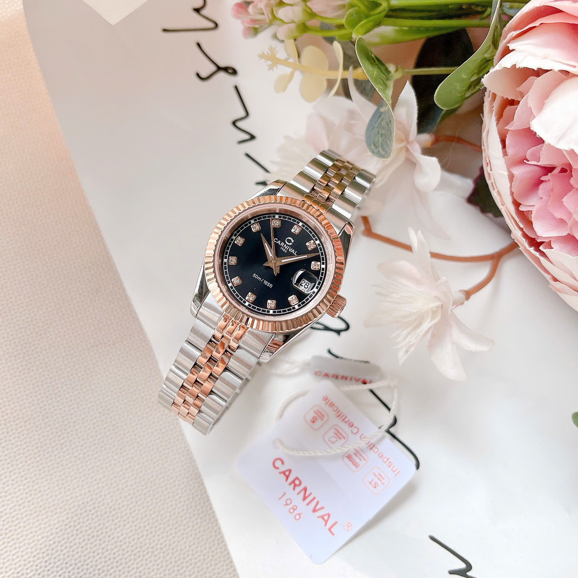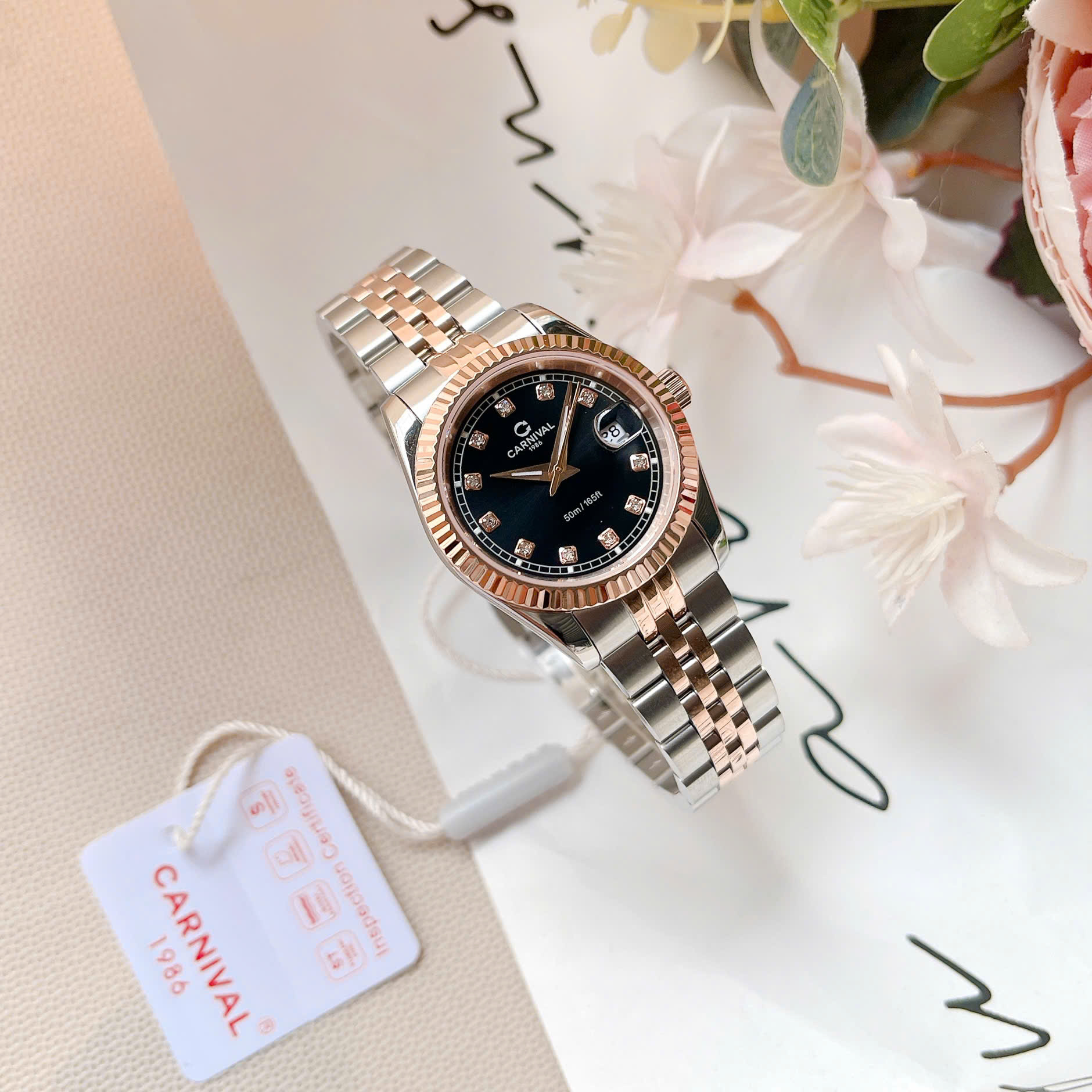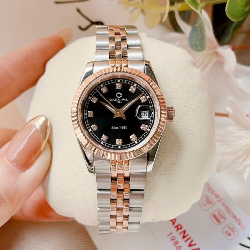 ĐỒNG HỒ Nữ Carnival 8131L-CH-D-Mặt Đen – Demi Vàng Hồng – Pin – Kính Sapphire