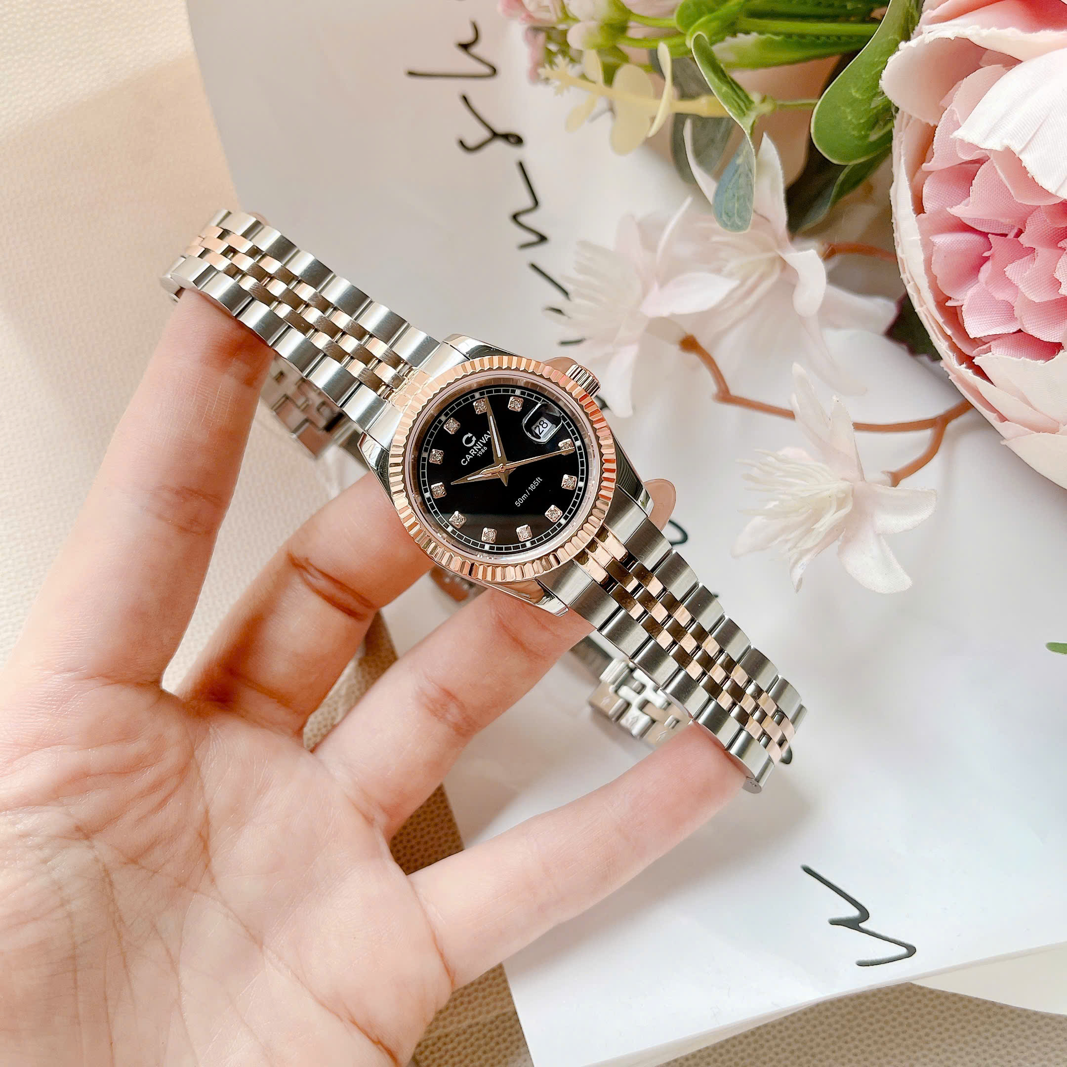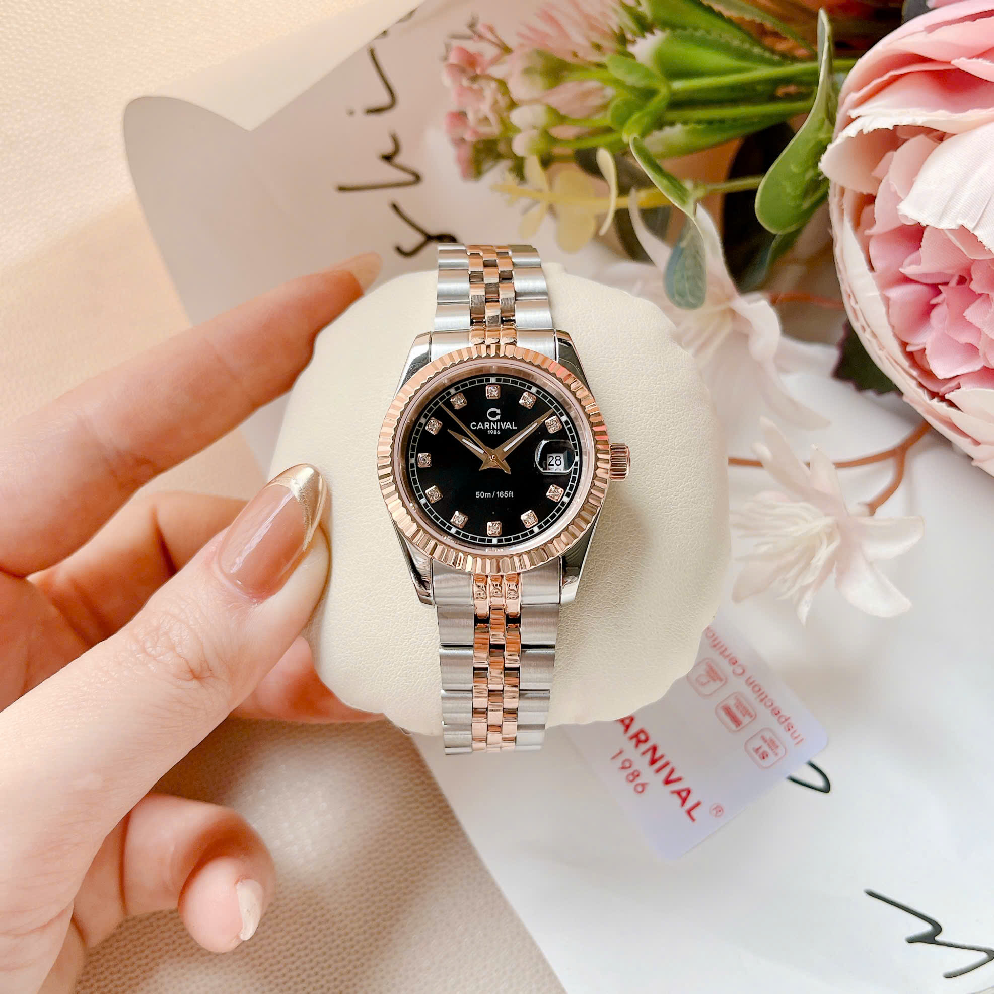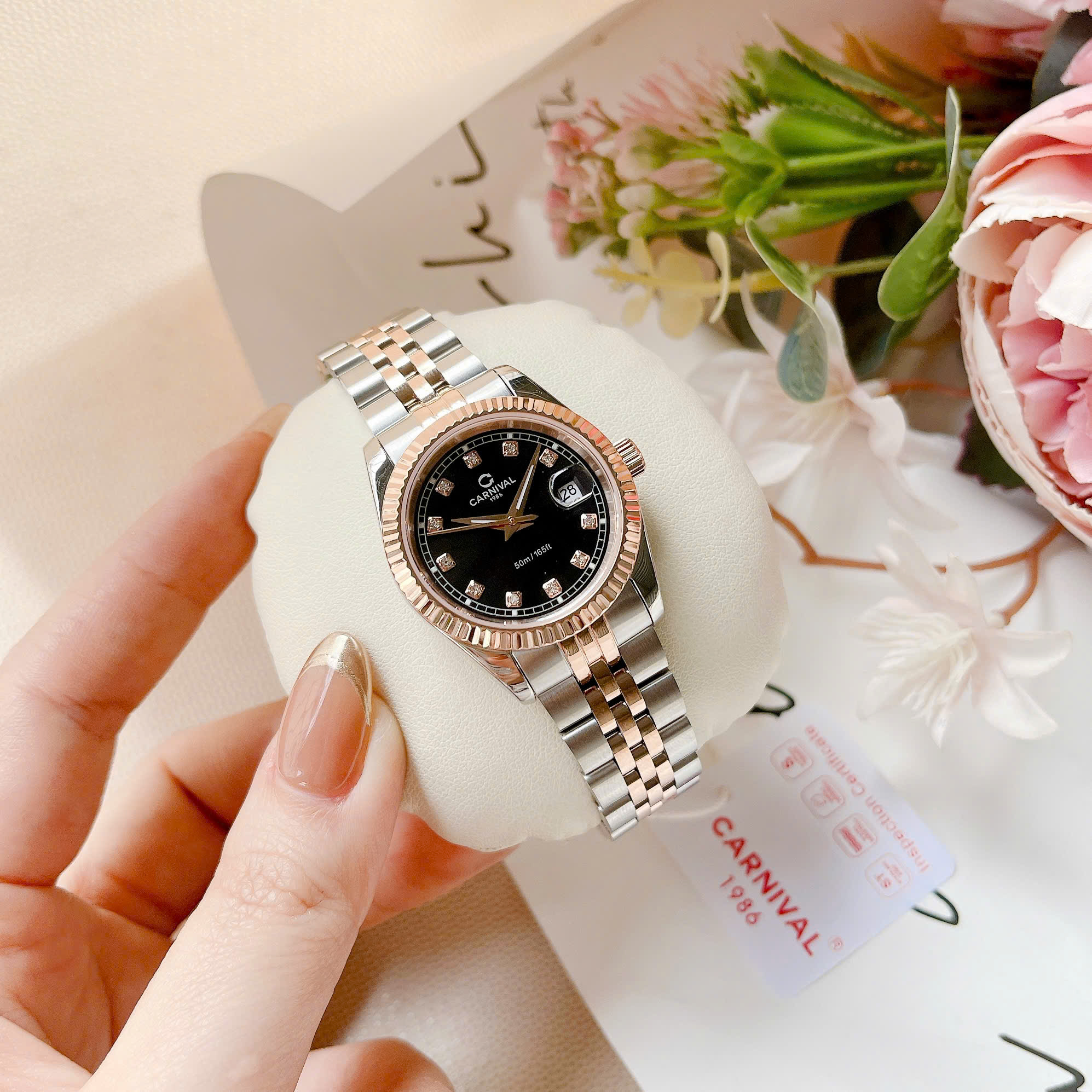 ĐỒNG HỒ Nữ Carnival 8131L-CH-D-Mặt Đen – Demi Vàng Hồng – Pin – Kính Sapphire