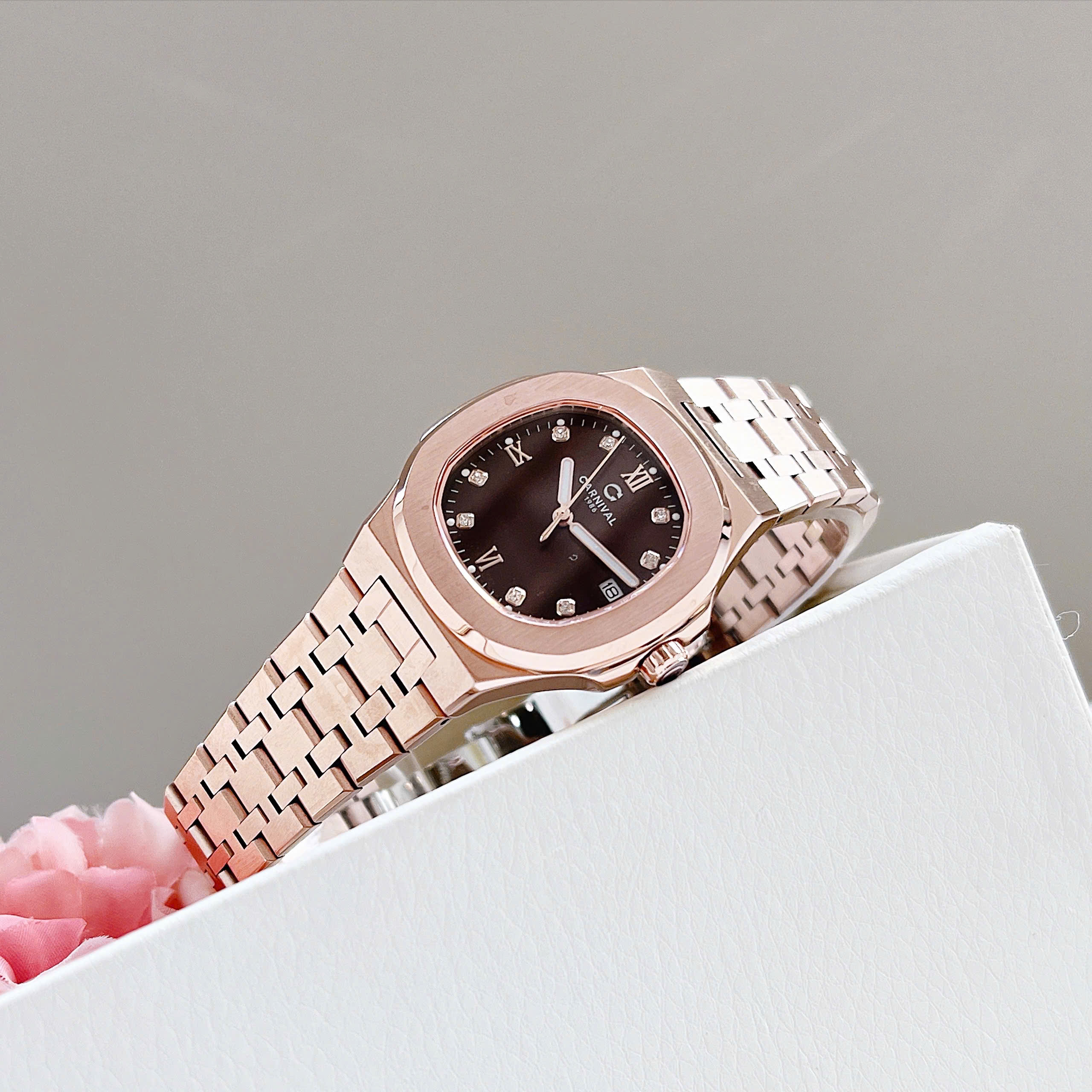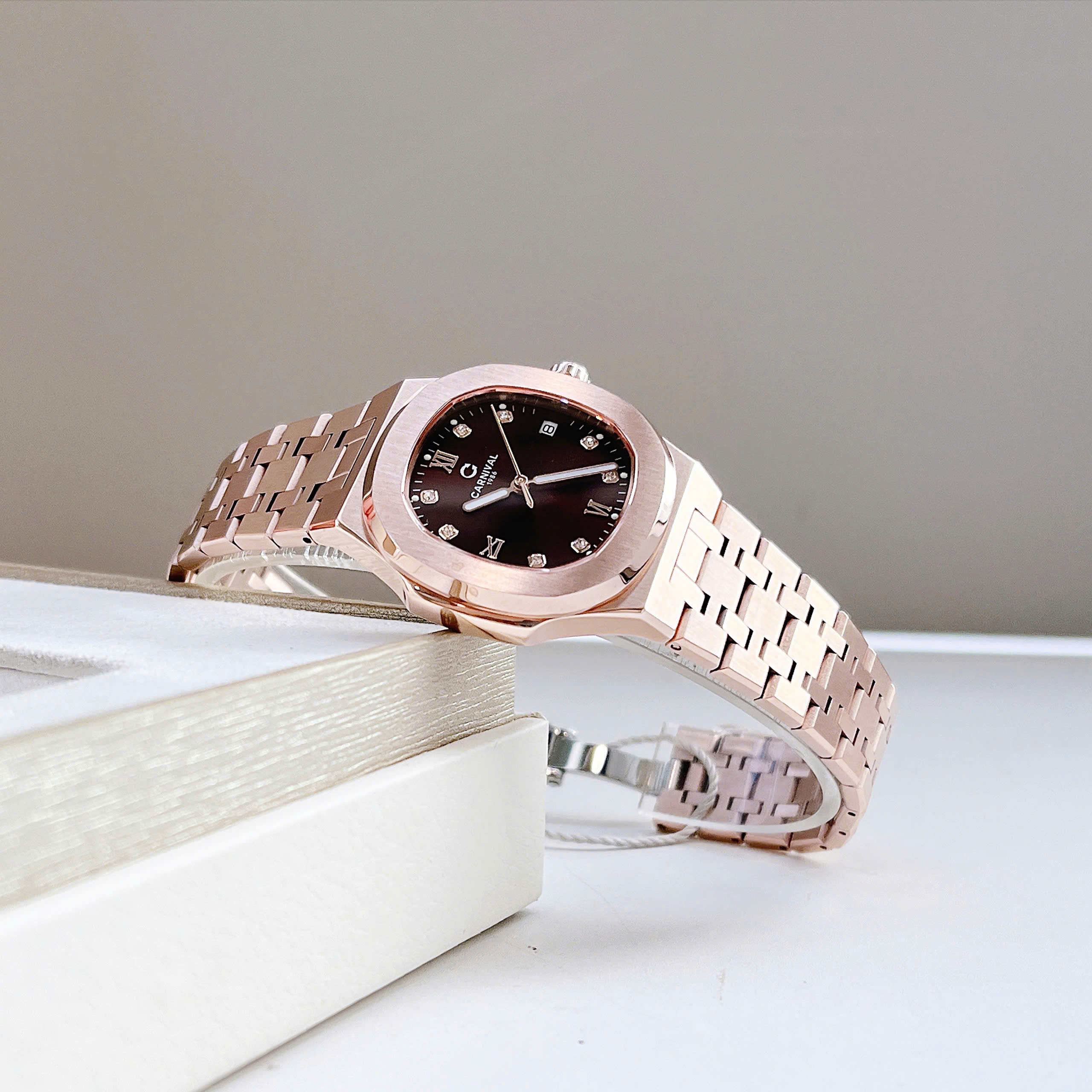 Đồng hồ Carnival được thiết kế với sự cân đối và hiện đại, lấy cảm hứng từ thiết kế cổ điển và thể thao. Dưới đây là mô tả tổng quan về thiết kế của đồng hồ này:
