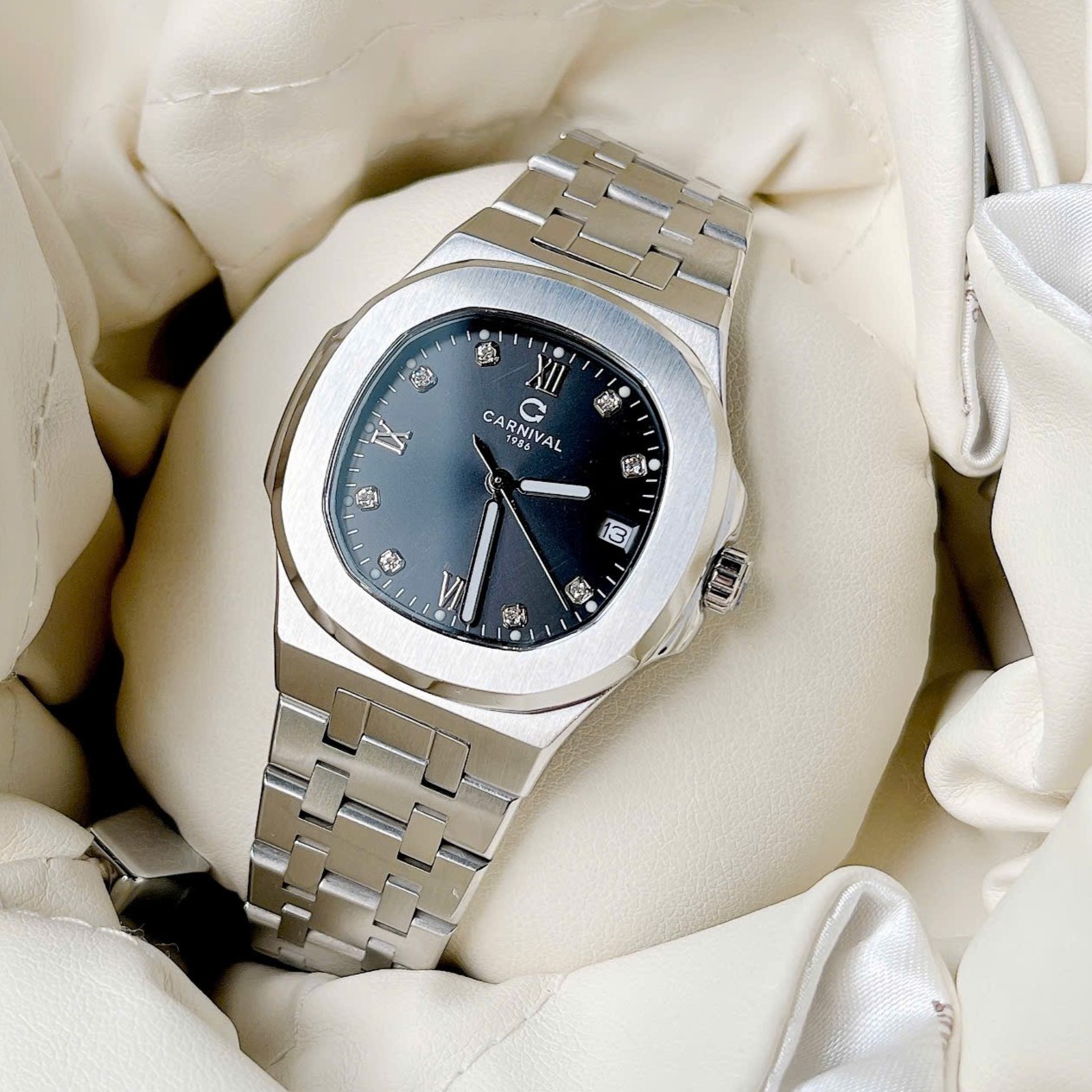 Mặt đồng hồ: Mặt đồng hồ của Carnival  có thiết kế tròn với một nền số đen hoặc xanh đậm, tạo nên sự nổi bật và lịch lãm. Chỉ số và kim được làm từ vật liệu phản quang, giúp dễ dàng đọc giờ trong mọi điều kiện ánh sáng.