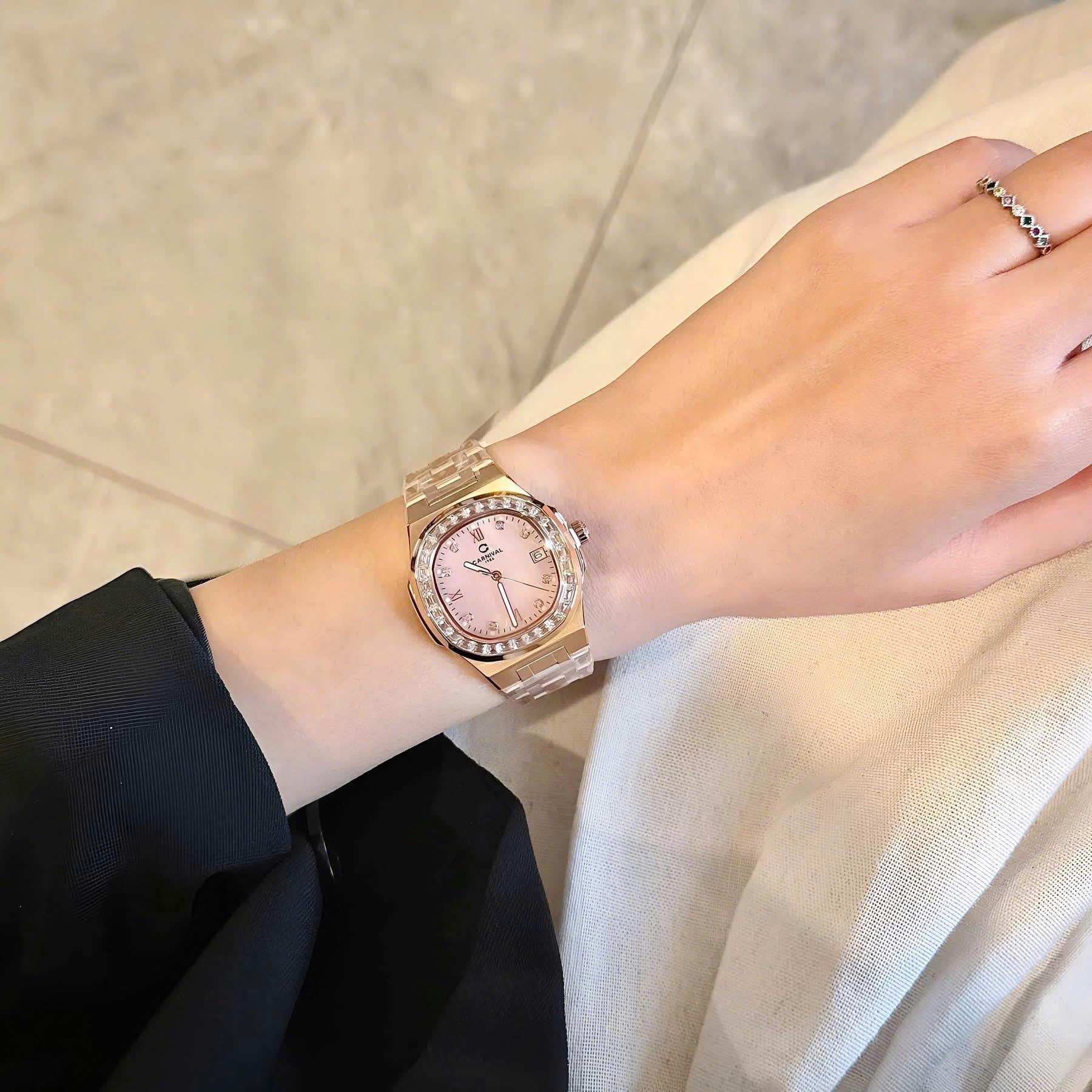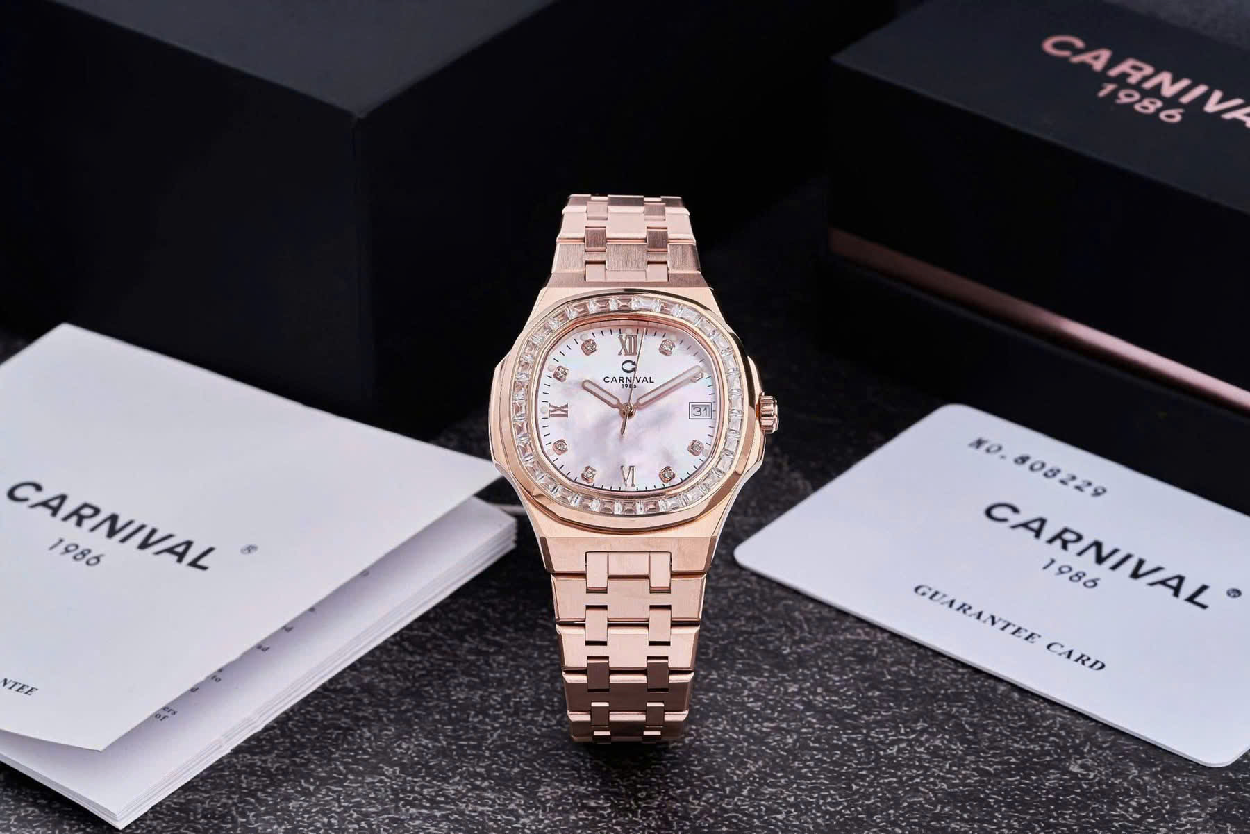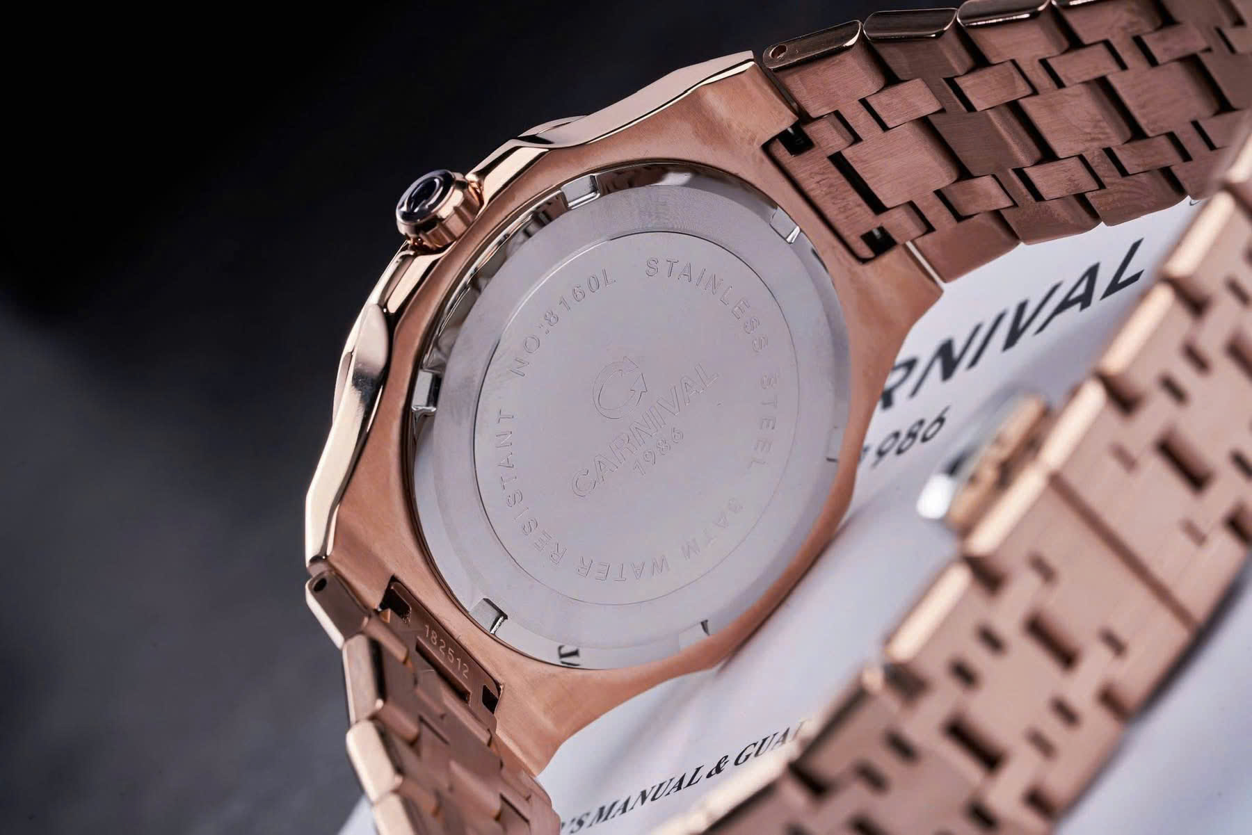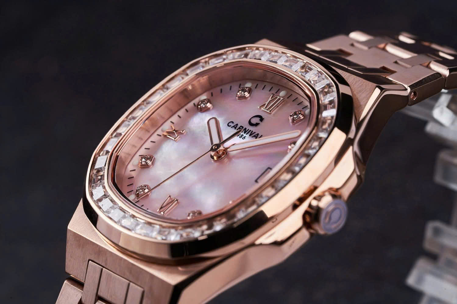 Dây đeo: Carnival  thường đi kèm với dây đeo bằng thép không gỉ hoặc dây da cao cấp. Thiết kế dây đeo có thể là mắt cáo (link) hoặc dạng dây đeo đơn (strap), tạo sự linh hoạt và tương thích với nhiều phong cách khác nhau.